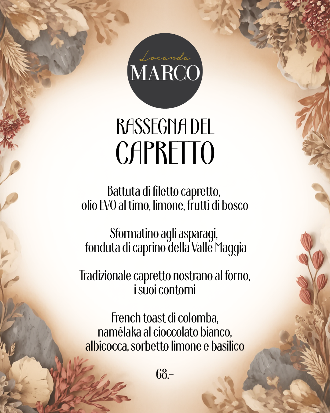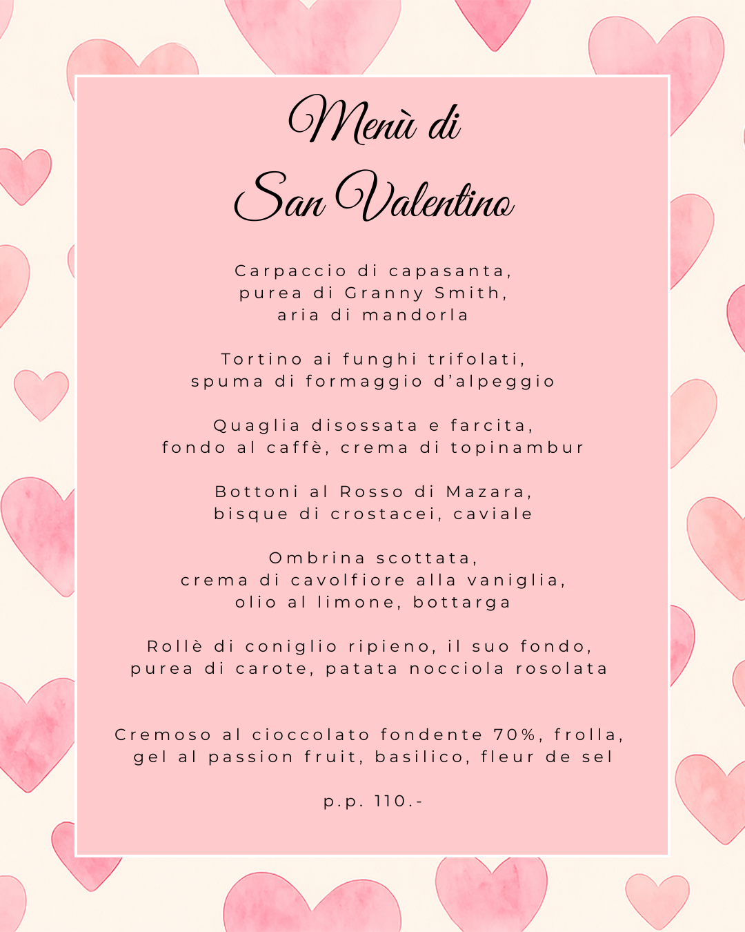 Il menù degustazione, i piatti à la carte e la carta dei vini raccontano la passione per l’eccellenza. La selezione di vini è curata personalmente e include etichette del Ticino e internazionali, insieme a una ricca scelta di distillati: grappe nostrane, whisky scozzesi, rum caraibici, armagnac e cognac di pregio.
