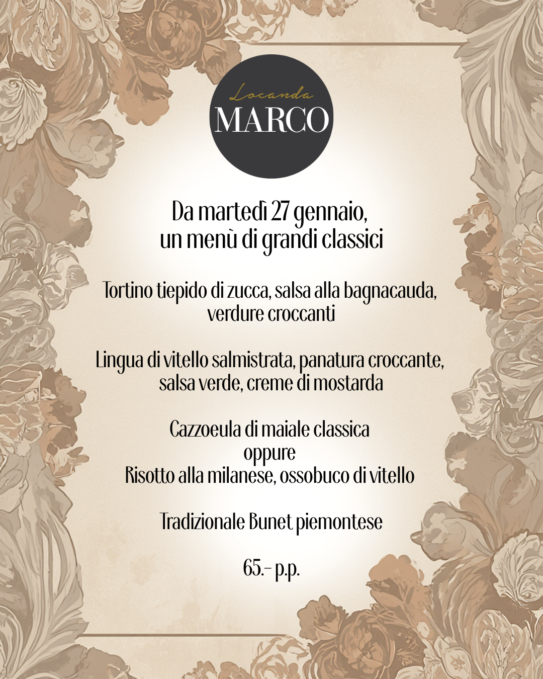 Il menù degustazione, i piatti à la carte e la carta dei vini raccontano la passione per l’eccellenza. La selezione di vini è curata personalmente e include etichette del Ticino e internazionali, insieme a una ricca scelta di distillati: grappe nostrane, whisky scozzesi, rum caraibici, armagnac e cognac di pregio.